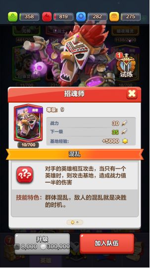 招魂师的技能混乱,可以使对手的英雄相互攻击、自相残杀。当只有一个英雄时,则攻击基地,造成战力值一半的伤害。 招魂师的技能为群体控制,把握时机适时释放技能,敌方的混乱就能为我方英雄反杀创造机会。