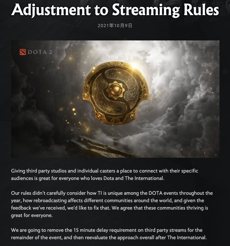 我们将取消比赛对第三方直播的15分钟延迟要求,并在国际邀请赛之后重新评估规则。