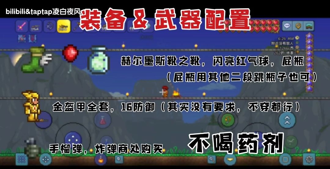 无需盔甲,无需药剂,只需要99手榴弹+赫尔墨斯靴+任意二段跳瓶子。