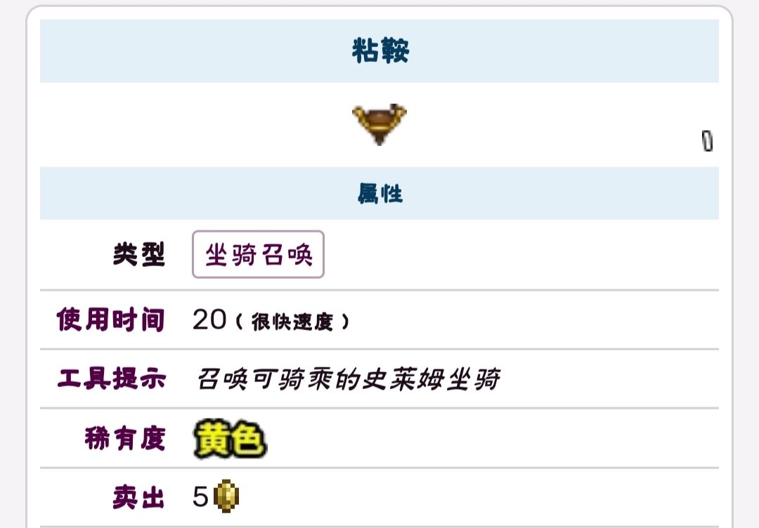 坐骑,装备后可以通过坐骑键召唤史莱姆坐骑,可以大幅提升跳跃高度和速度,但会削减移动速度(视频末尾有演示)