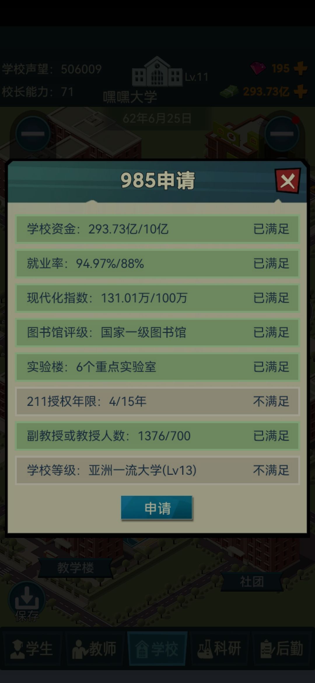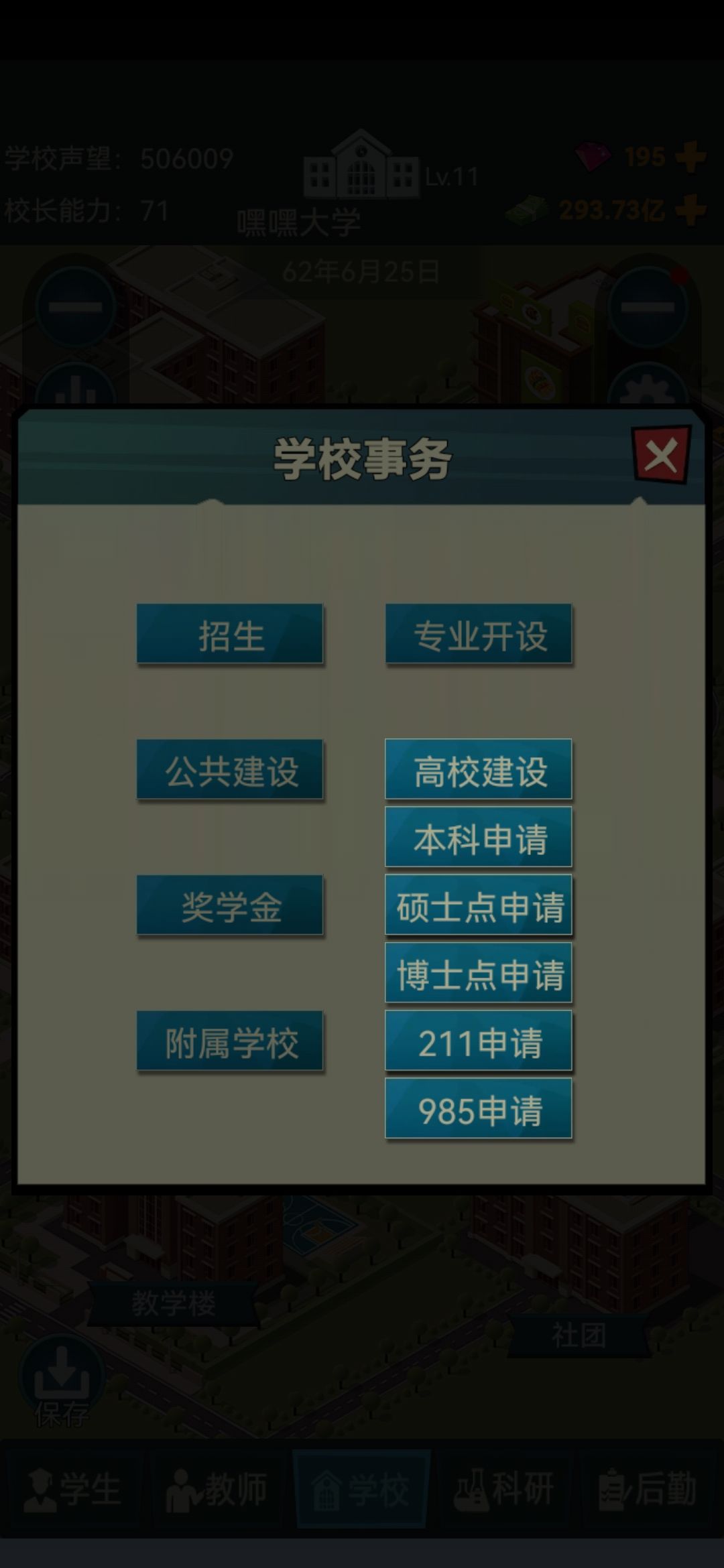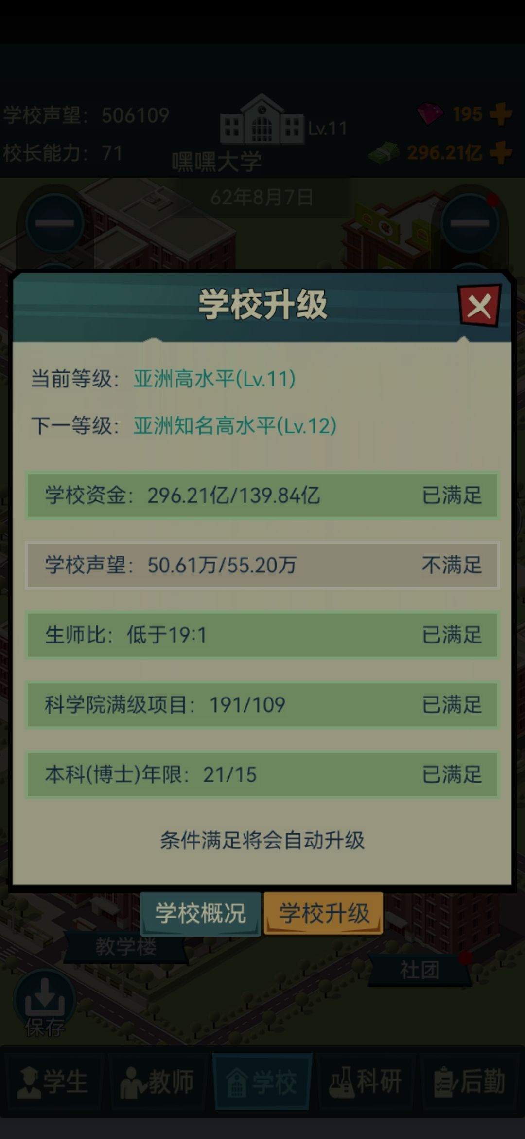 🌸学校等级靠的是资金和声望,资金也是开六倍速怼就好,声望就特别难