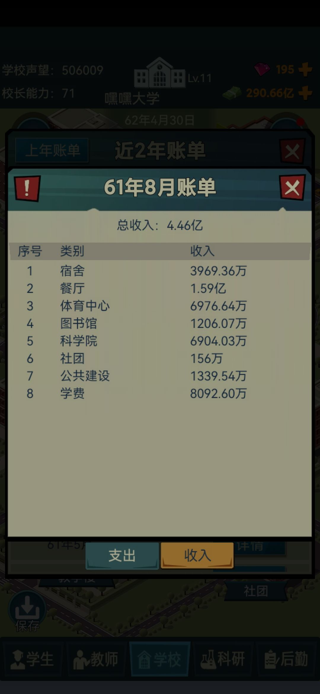 🌸1.首先收入来源前期靠广告,中期靠餐厅和学费(餐厅平均2亿,学费平均1亿)