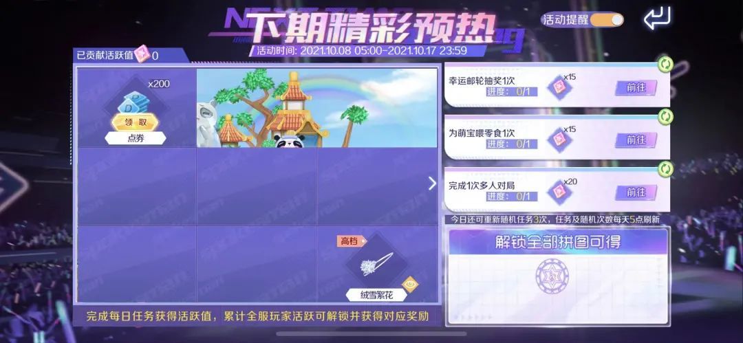 10月8日-10月17日期间,完成任务即可获得追梦同行(上衣)&绒雪絮花面饰,解锁全部拼图还可获得魔幻咒术称号!