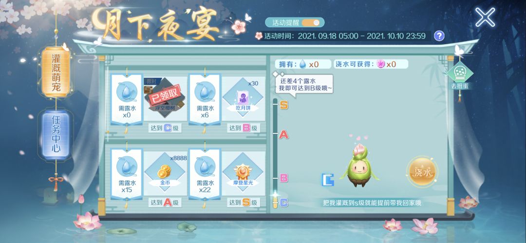 截止到10月10日,参与并完成月下夜宴活动,即可免费领取S级宠物-浮空樱树!还没有参与活动的小主人们赶紧行动起来吧!
