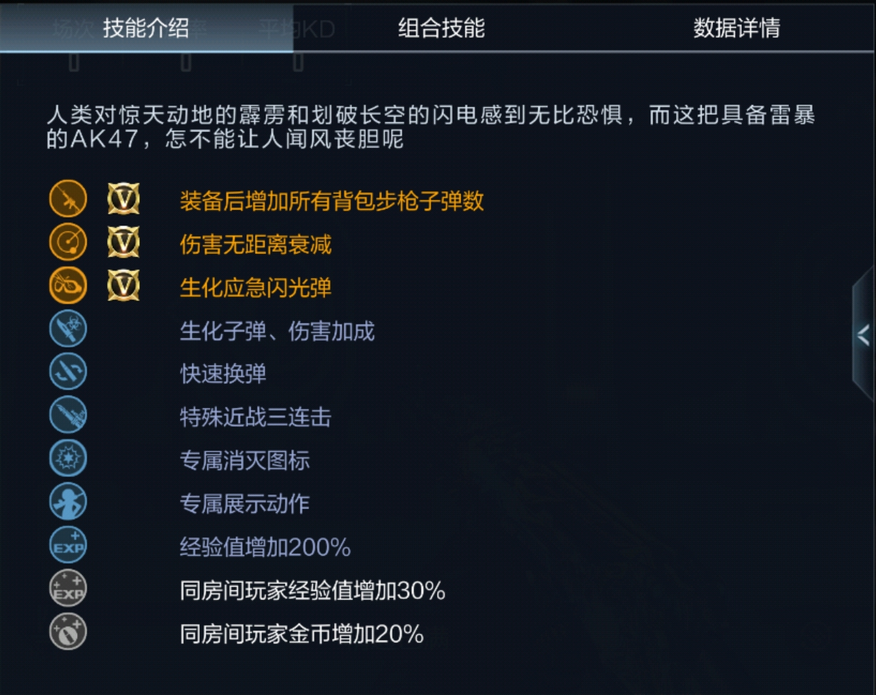 AK47雷暴具有生化应急闪光弹的特殊词条,此闪光弹与正常闪光弹没有任何区别,在生化中还会增加40发主弹匣载弹,同时大幅度提高伤害,伤害如下图所示