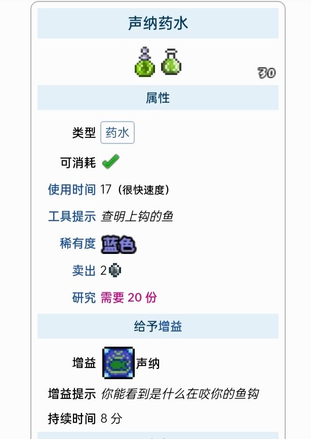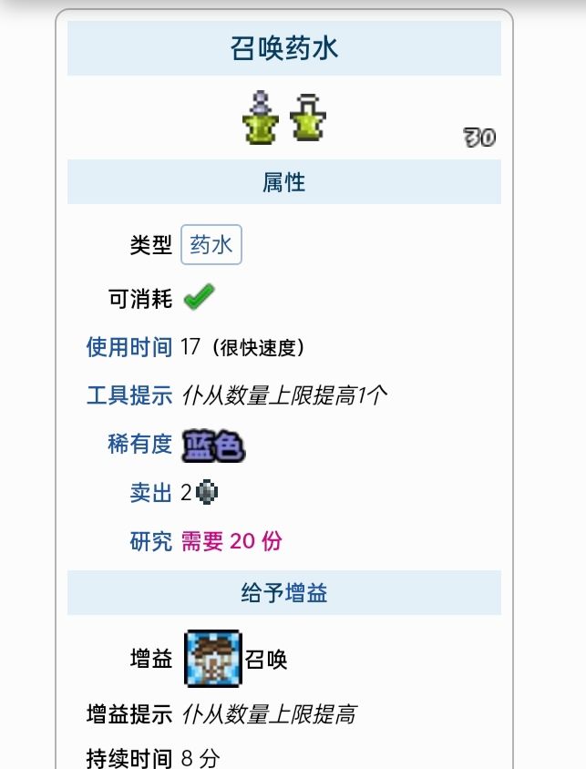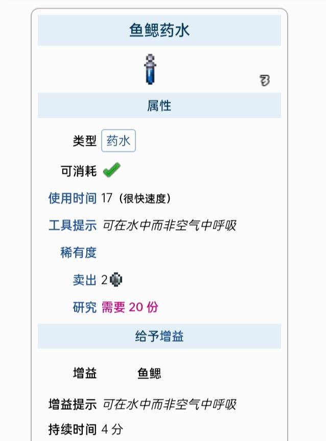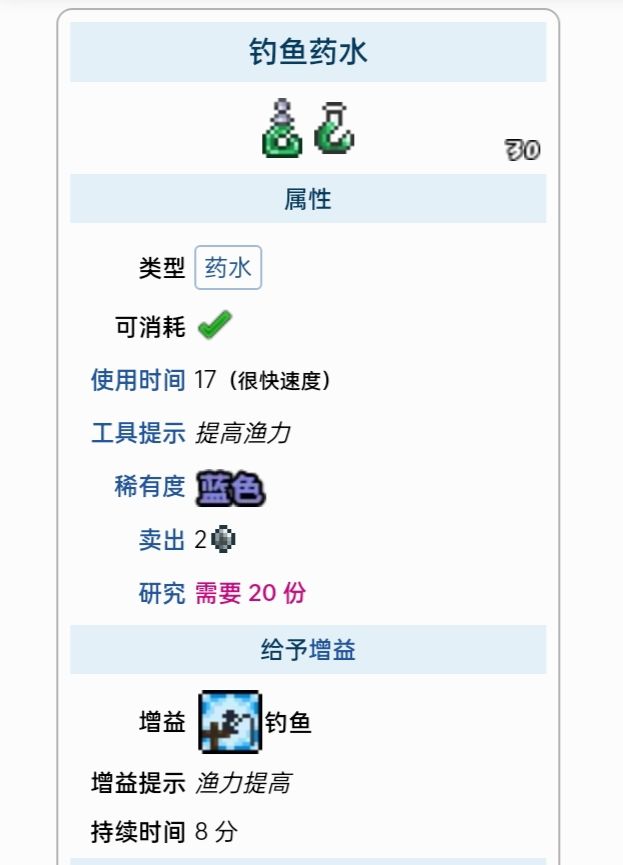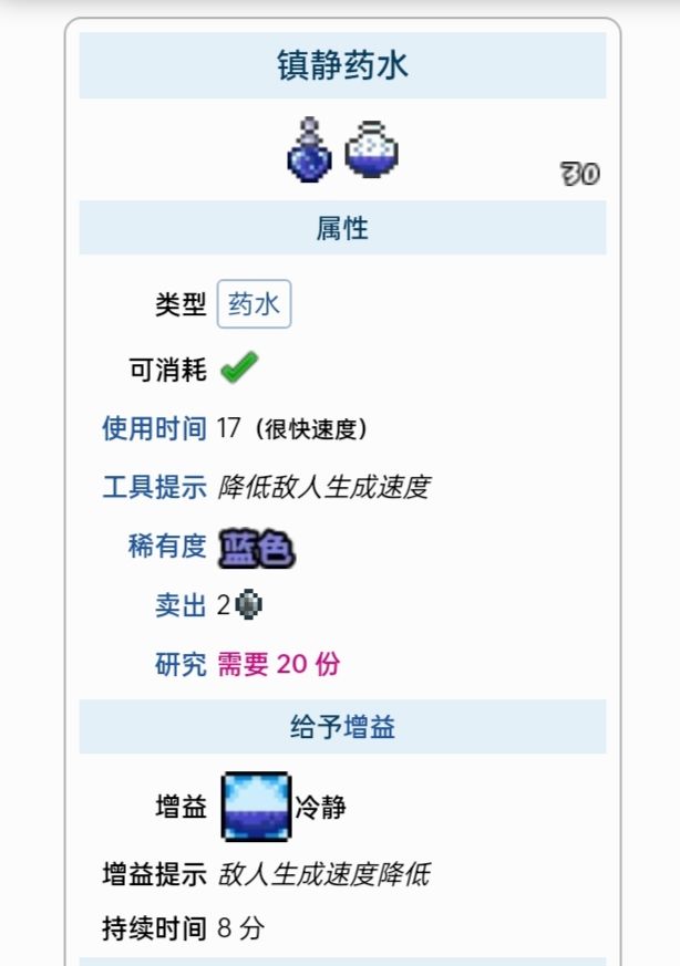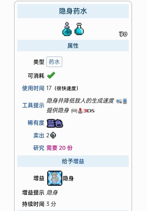 药水是一类能够恢复生命和/或魔力、或给予临时增益的消耗性物品。药水常见于天然宝箱和罐子中,也可以掉落自敌怪、购买自NPC或制作得到。大多数药水可以在放置的瓶子或炼药桌处制作,但药剂必须在灌注站制作。药水增益可以任何时候都可以取消,通过双击增益图标首先合成药水和药剂必不可少的需要炼药台(地牢中可以找到)和灌注站。炼金台有33%的几率不消耗材料就可以产出药水,前期的话放一个玻璃瓶在桌子上就可以,灌注站是制作药剂必需品(一次只能使用一种药剂,激活第二种会自动取消上一种,药剂在死后依然会维持激活状态,不像其他药水。药剂全部在灌注站处制作,所有药剂都持续 20或 15分钟)