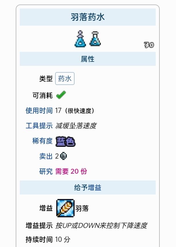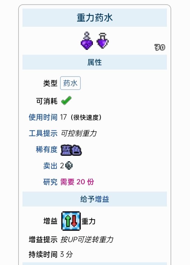 重力药水:水瓶,火焰花,死亡草,闪耀根,羽毛