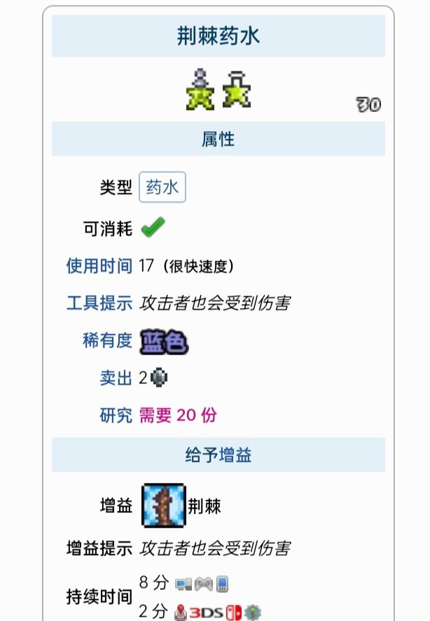 荆棘药水:水瓶,死亡草,仙人掌,蠕虫毒牙,毒刺