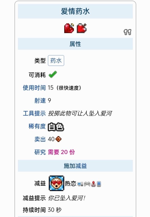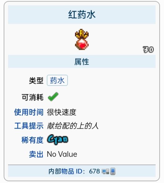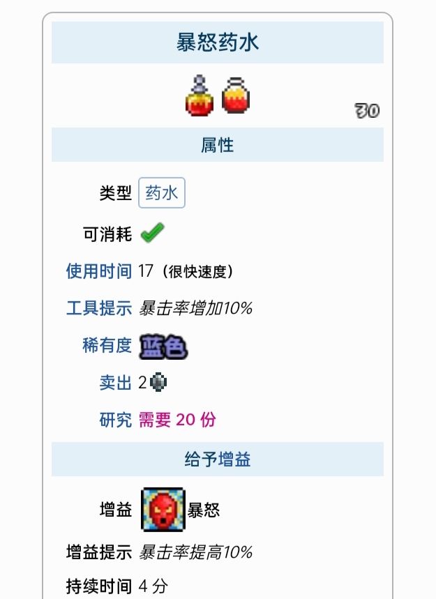 红药水红药水是一种减益药水(不是在彩蛋图,他只是减益药水),会随机给玩家造成黑暗、中毒、诅咒、着火了!、虚弱、困惑、缓慢、沉默、破损盔甲、流血、和窒息减益,效果持续1小时/2小时,能轻易地杀死玩家(在彩蛋图是造成随机buff,有可能全增益,有可能全减益)