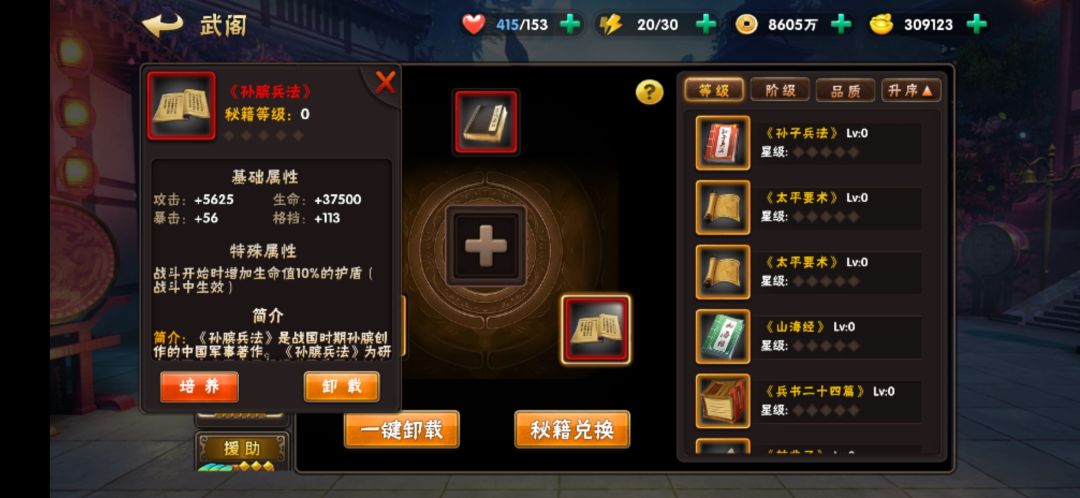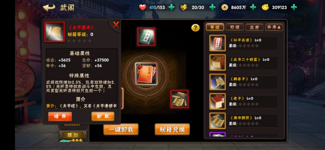 大家早鸭 我刘大美人又来了 今天我来说秘籍了 因为很多小伙伴咨询 一个一个回答挺累的 直接出个帖子一劳永逸 其实我不想说秘籍是因为搭配方案太多 谈不上对错 只有合适不合适 先说武将必备的吧 ①奶妈必备战国策和吴越春秋 因为这两个能保证奶妈先手大招 奶妈可是救死扶伤的存在 所以她必须要多几次大招 ②肉盾必备或者也可以理解为前排必备吕氏春秋 老子 孙膑兵法 ③青囊书 一个奇怪的存在 甄姬 赵云必备 其他主将也可以使用 但是自带吸血的武将更能发挥出它的价值 ④兵书24篇 一个针对控制而存在的秘籍 谈不上厉害 但是面对控制很好用 ⑤山海经 太平要术 司马法 增加全队属性 秘籍位置有限 只要有位置还是把这三个带着吧 至于谁带 你们自己决定!!!其他秘籍我就不说了 因为都是一目了然的 你们很容易分辨 而且帖子最多只能9张图片 再提醒一下萌新们 紫色以上秘籍有多的别急着分解 因为进阶高了是可以替代没有进阶红色秘籍的 你们看我助战都带了不少红色秘籍 而出战武将居然还带的有橙色的 因为橙色进阶高了 属性比没进阶红色强