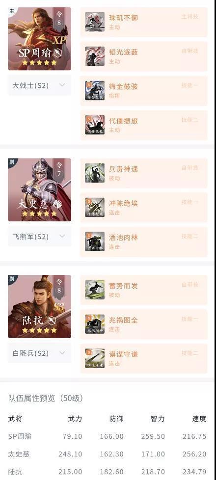 天义枪特别的阵容框架,让孙策不受画地为牢限制,空城计对孙权影响也非常低,并且队伍中只要孙策兵力健康,就不会影响阵容强度。孙策输出方式为连击,有厚德载物+徐盛+画地三重保险,即使遇上太史慈也有一战之力。