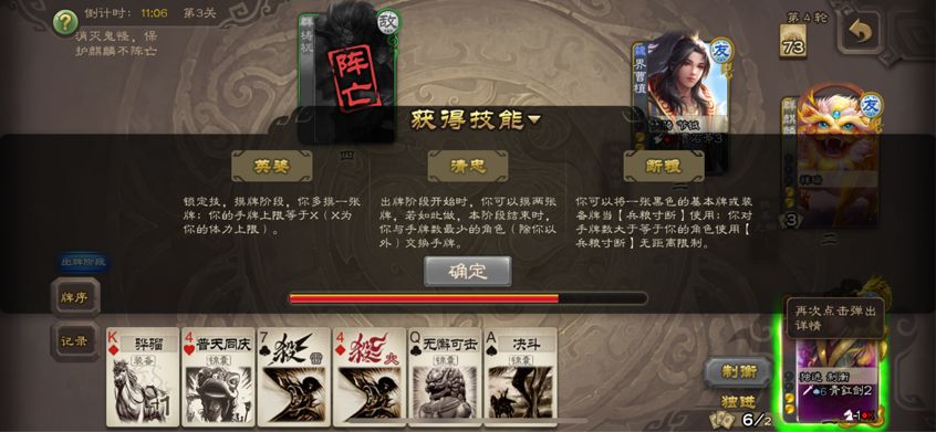 第三轮的boss血最厚,技能也最多,他的技能相当于【反馈】+【利驭】+【执义】的结合体,所以打起来比较麻烦。但此时你们技能也全了,麒麟如无意外也7上限5体力了。所以打他就只能靠过牌取胜,只要你牌足够多,三轮以内大boss必死。