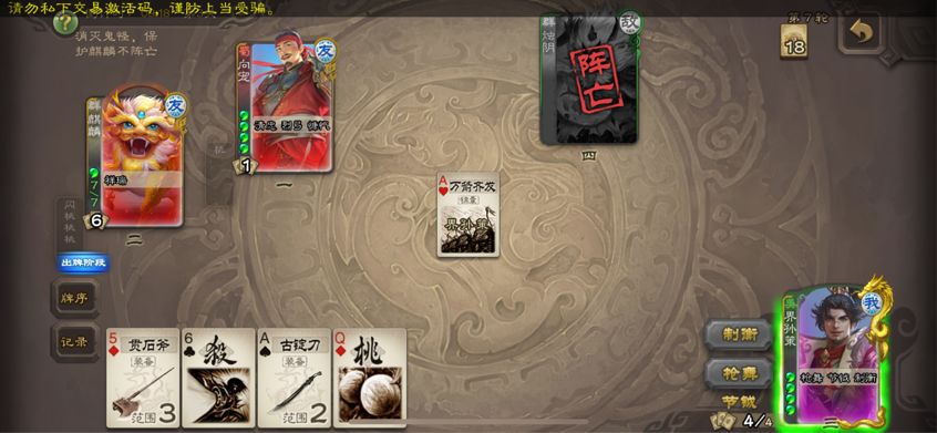 然后第一轮结束,俩人中有一个要选择捞人的技能,另一个继续过牌型技能,为什么呢。因为第二关的boss准备阶段可以对每个人造成一点伤害,并且还有界【奸雄】加持。你只有过足够多的牌,才能找桃子,并且来帮麒麟这个憨憨儿回血,因为此刻他已是5体力上限了,回合结束时可以弃置两张牌来帮他回血。