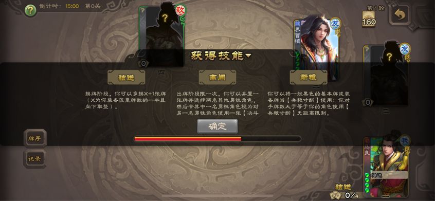 首先开局选技能,就得留意有没有过牌型的技能,因为第一关的boss混沌的攻击力其实不高,所以没必要选择保命的技能,什么青囊、急救、牺牲呀一开始压根儿没用。就如下图,我选择的是【独进】,开局小英姿还不错~