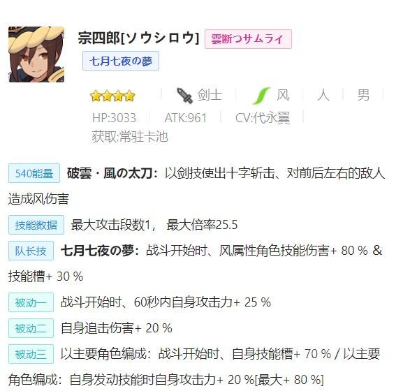 四郎:具有一定群体启动能力的风属打手,技能组配置让他开局爆发很高,同时特殊的技能范围让他能在大蛇之类的多目标本里打出很高的群体伤害。