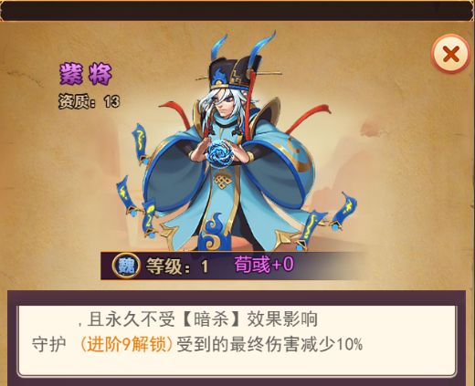 警戒(进阶8解锁)上场1、2次受到的伤害减少40%,且永久不受【暗杀】效果影响