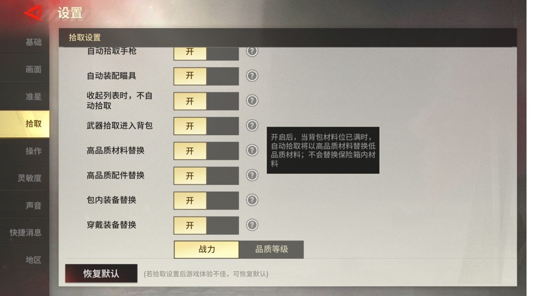 (物资均可按“战力”“品质”自由控制拾取)