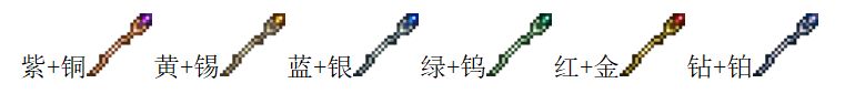 宝石法杖是初期就能够制作的魔法武器,由宝石+金属锭制作。由于一个世界只能生成4种金属矿石而无其他4种,所以以上法杖一般情况只能制作三种。