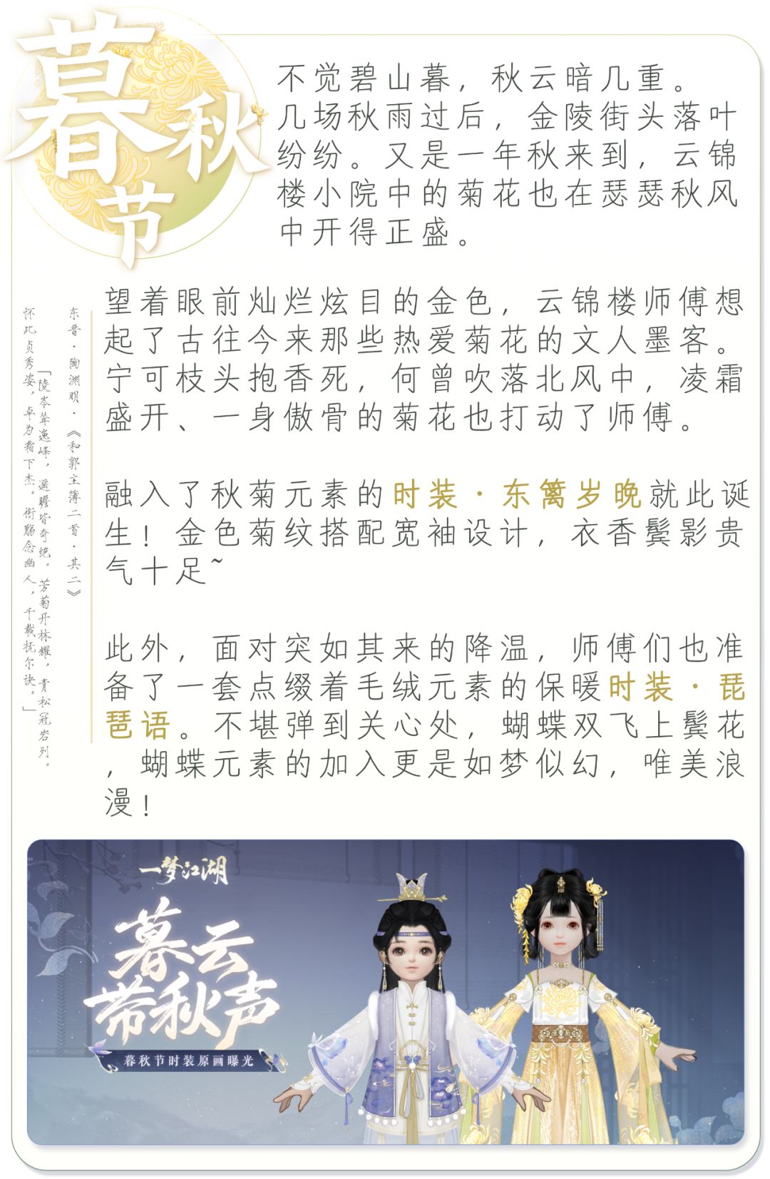 时装·东篱岁晚与时装·琵琶语将于10月15日正式现身江湖!秋日已至,气温骤降,快换上全新暮秋节时装,去江湖风景极美处,留下你绰约的身姿吧~