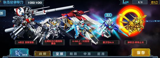 这是目前相对最理想的主角机体阵容搭配,2.0新典藏机体ELS为队长,搭配同样是近期新机体的G-SELF完美背包,再与其他老将们配合,胜率极大。