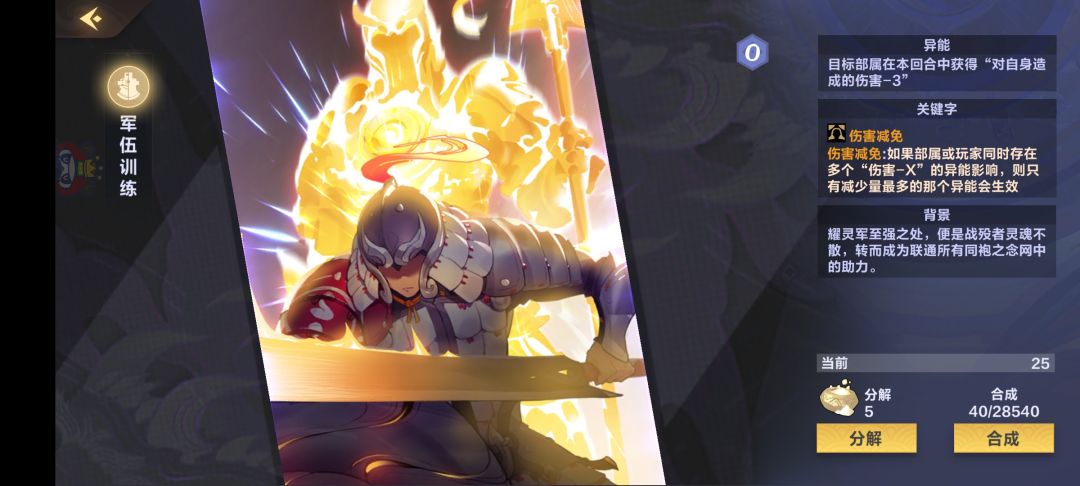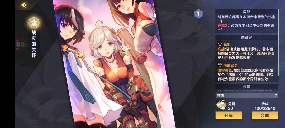 好,下面重点讲讲这张卡,战友的关怀,1费全体减伤1,充能2就变成全体减伤2,全体硬抗一个打2aoe就靠他了!例如阳的龙影,阴的波动,甚至只要部署生命大于2,充能以后甚至能硬抗水的万剑,火的神火!值得注意的是这张卡和军伍训练一样,是单段计算伤害的,也就是说每次伤害都能减伤,比如如果对上雷的琴和宗主,紫英的二段大招,都是单次只能造成1伤害打多段的。随便他们打多少次,伤害永远是0,想象一下对面宗主不停的扎,我们这边头上不停的冒出-0-0-0的数字时的感受😂