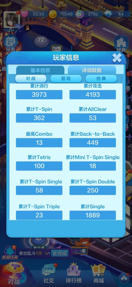 各位方块超人大家好,这里是方块导师玄天明空。我从去年开始被俄罗斯方块的魅力所吸引,热衷于各类对战方块游戏(TOP,T99等),听闻俄罗斯方块环游记来到中国,我自然也是加入其中,下面是我本次内测的天梯数据: