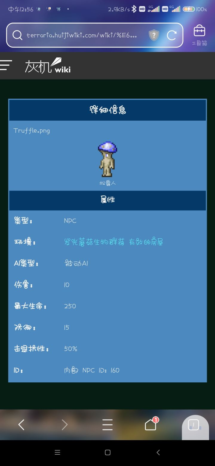 !!!要让松露人入住,必须在困难模式中有一间位于(或附近)地表发光蘑菇生物群落的空房屋。地表发光蘑菇生物群落必须由玩家手工创建,并不会自然生成。这需要有 101 格蘑菇草和蘑菇植物。!!!