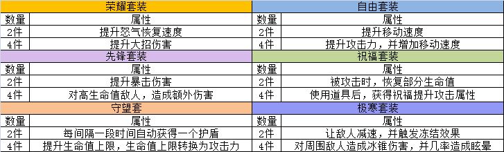 我们在原有的装备基础上,加入了6种套装,穿戴齐全后可以激活强力套装属性,每种套装属性都非常有趣,勇士们可以根据自己喜好选择。