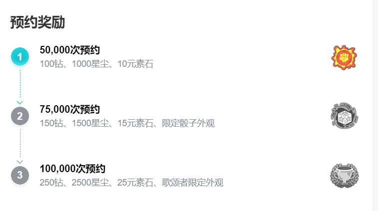 一、预约游戏满10万,即送最高500钻和限定歌颂者外观,骰子外观