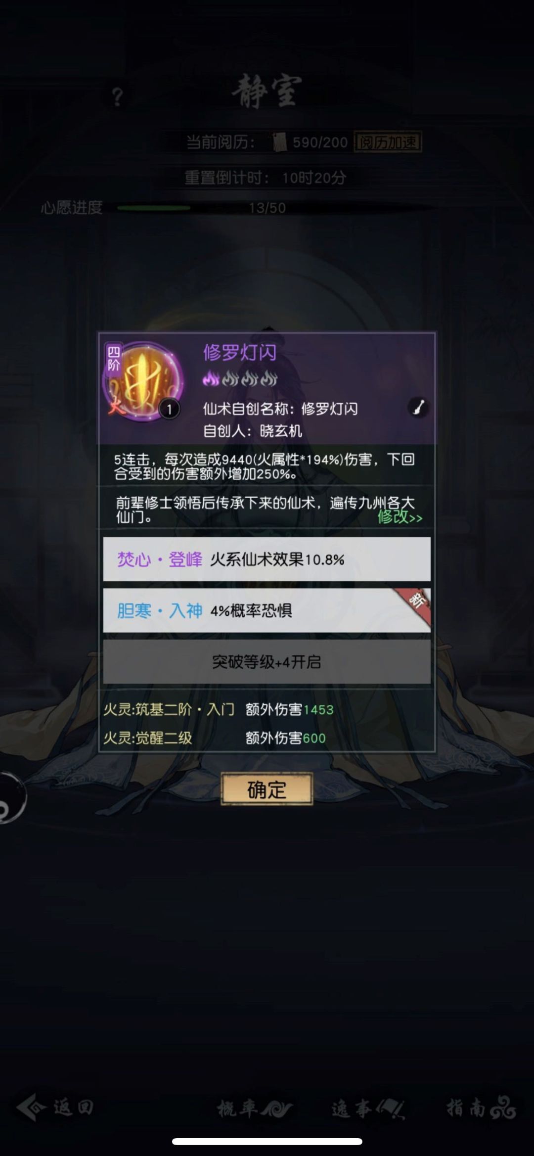道友在游戏中达到一定境界时,便能对仙术进行刻印。各位可以在宗门-静室中,通过消耗阅历值,对已有的仙术刻印上属于自己的法印,并对仙术附加各种不同的效果。仙术可以重复领悟,且随着等级的提升,同一个仙术至多可以添加3条法印,最终获得自己满意的仙术效果。
