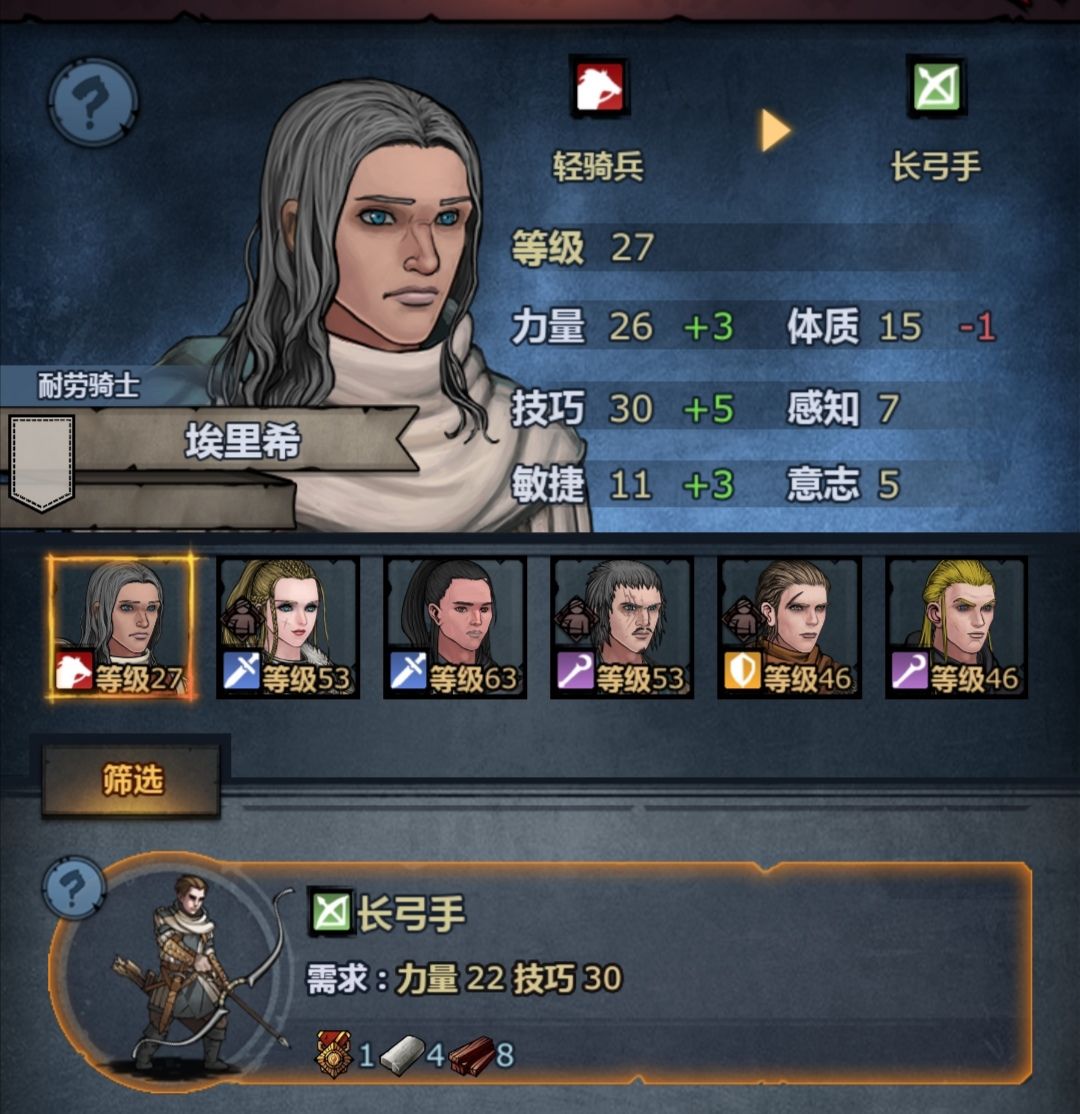 路线为见习骑手-弓箭手(凑属性)-轻骑兵-勇士(凑力量)-长弓手