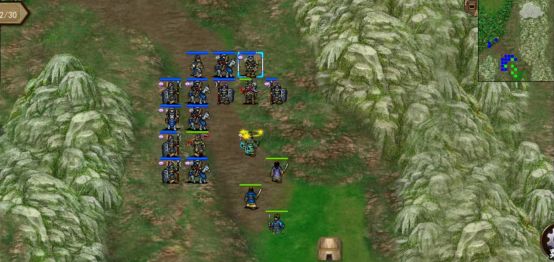 2. 钟繇先手群控,曹植站钟繇没羽箭范围内(神机被动)清兵,利用3个回归将,第一回合,可以把前面部分的兵清掉,顶多剩最前面的,但已经控住了。