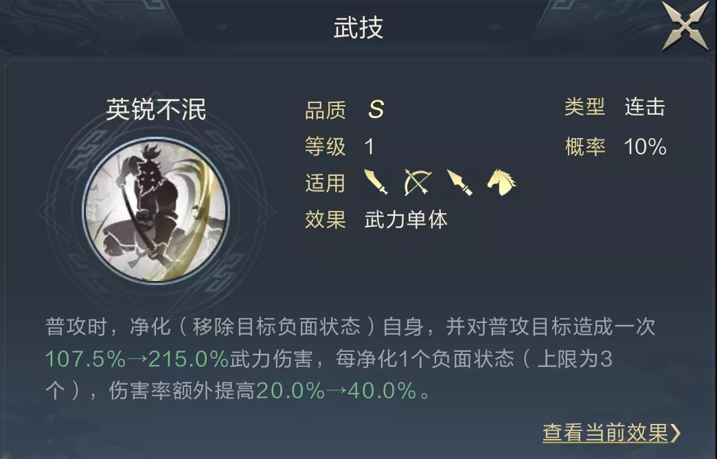 第三副将主打纯连击输出,在常规战斗中可以使用怒目+酒池组合;因为队伍无净化技能,若经常与黄天等状态队伍交战,建议将怒目更换为英锐不泯,以保证许褚的输出稳定。