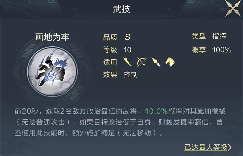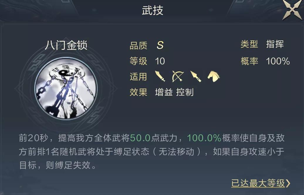 荀彧必备武技八门金锁,依靠张辽提供的高额攻速,能最大限度保证开局锁人的稳定性,另一个技能可以根据敌人类型进行更换,如黄天等法系队伍使用空城计,吴封等连击队伍或武力队伍则使用画地为牢。