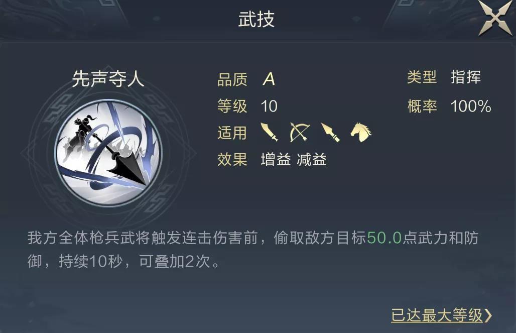 张辽在队伍中无需承担输出,配置先声夺人给核心副将提供增益(使用典韦时可更换陷阵强军),另一个武技推荐横甲刁军、贯颐奋戟等功能性输出武技。