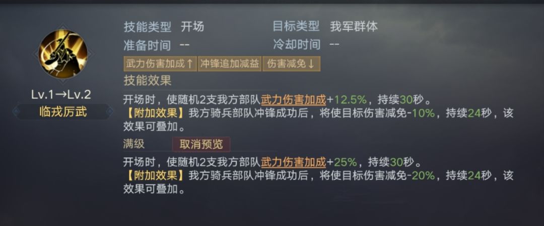 曹丕自带技能【临戎厉武】包含了两方面增伤效果,虽然作用目标不太稳定,但可以利用阵容站位、搭配骑兵武将等方式强化该效果,只要从侧面冲锋到了敌方后排武将,我方的点杀收益将进一步增强。