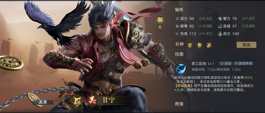 吴•甘宁的点杀能力也很出众,其自带技能【袭江倒海】能对敌方兵力比最低武将造成极大伤害,通过快速点杀残血目标来达到以多打少的局面,可携带宝物和群•吕布一样。