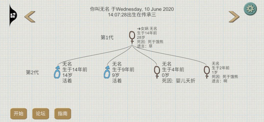 我今天好不容易重新开女娲档,想着养孩子,结果养了俩儿子,一个抓兔子去了,也没抓回来,另一个3岁以后跑没影了,后来我抱着我女儿1岁的那个往左下走做篮子,看看他俩现在黑色的地域,2儿子在吃香蕉,大儿子抱着抓兔子的篮子不动弹,2儿子给我一个苦笑的表情,后来就没影了,然后不到5秒跑出来个熊把我咬死了。气死我了。而且棉花糖和桑果就在旁边儿,你们不吃,非得吃醋栗,这就算了,居然看见我后还掏熊。我建议开个ID系统,不管是重生多少次,同一个账号id不变。