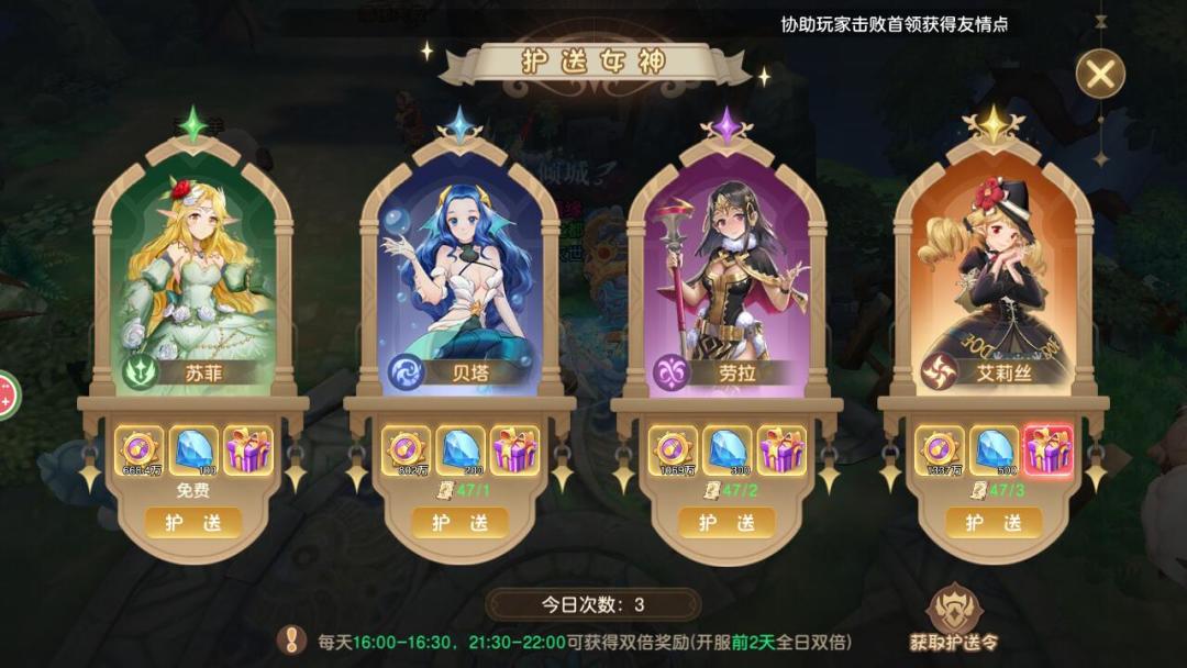 (护送不同女神奖励也有所不同,消耗“护送令”越多的女神,奖励也会越丰厚哦~)