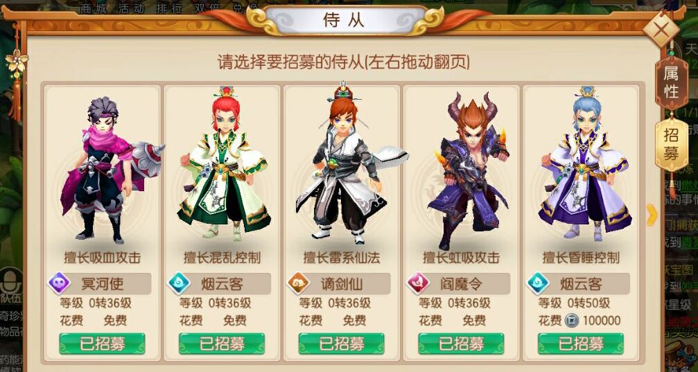侍从招募可以招募任一职业,最多可上阵4名。进行合理的职业搭配,打怪pk不在话下!