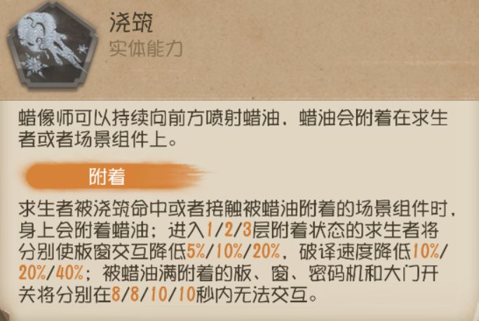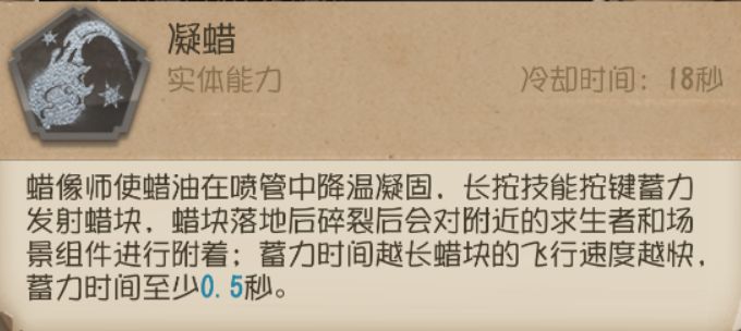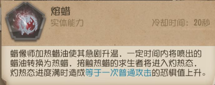 ★实战解析:该技能会将【浇筑】和【凝蜡】时的蜡油转换为热蜡,当求生者的灼热态进度满时可以造成一次普通攻击的伤害。求生者接触到热蜡后,即使没有继续被热蜡喷射到,恐惧值仍然会在短时间内持续上涨一定进度,这大幅度提升了蜡像师追击、守椅和控场的能力。