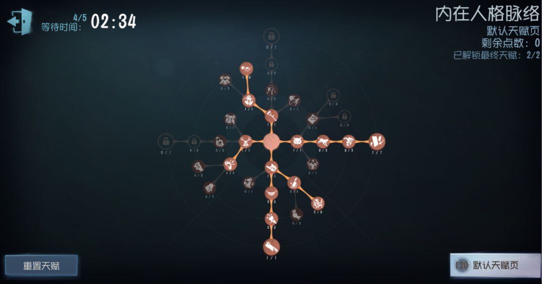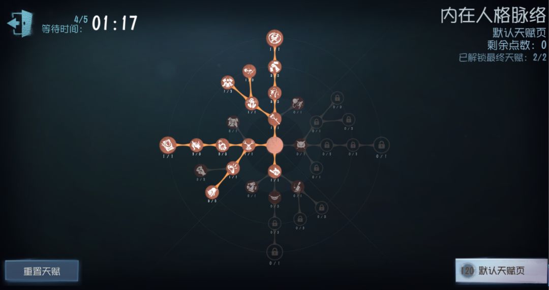 推荐辅助特质:前期携带【闪现】/【窥视者】/【巡视者】,后期切换为【传送】/【失常】这套天赋没有携带【挽留】,但既可以掌握前期的对局节奏,在后期开门战也有一定的优势。【张狂】可以快速解锁一阶技能,【底牌】在面对后期复杂的对局情况时,相当于一张王牌。由于满进度的【熔蜡】可以对求生者造成伤害,相对而言【挽留】的作用会大大降低。