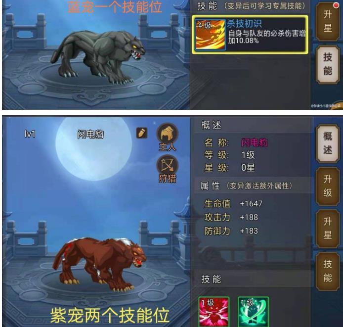 作为战宠的核心,最值得考究。根据设定,蓝色战宠具有一个技能位,紫色战宠有两个技能位,只有最高品质的橙色战宠具有两个技能位的同时,还具有触发变异后才能开启的附加第三个技能位。