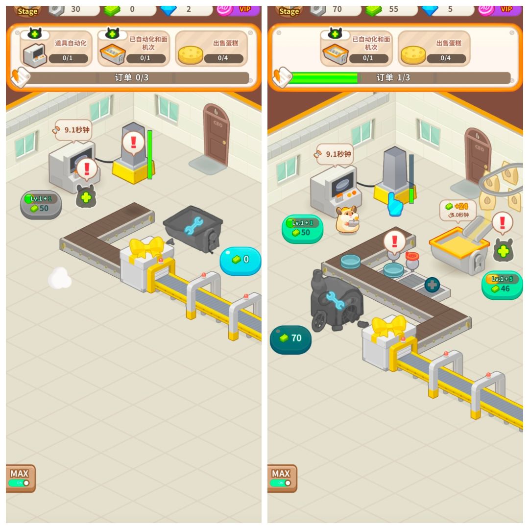 一开始,由于资金不足,工厂无法实现自动化生产,需要玩家手动进行生产操作,生产蛋糕完成任务后,可以获得收益,用于雇佣仓鼠员工实现自动化生产!