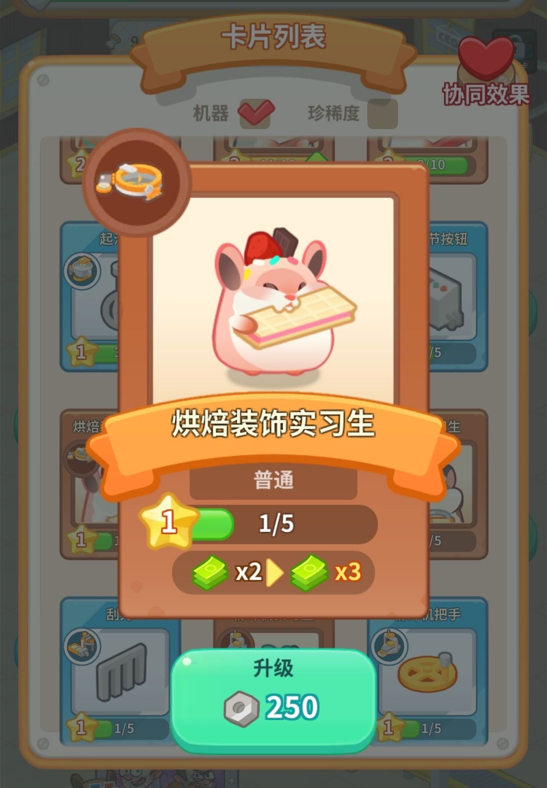 而获得的仓鼠员工们和蛋糕生产设备,可以在右下角卡牌列表查看,它们的信息都会变成“动态”卡牌,收藏在你的卡牌列表里~