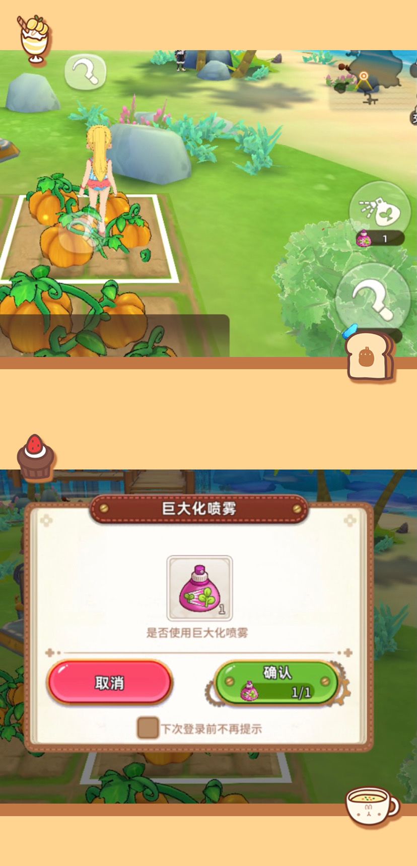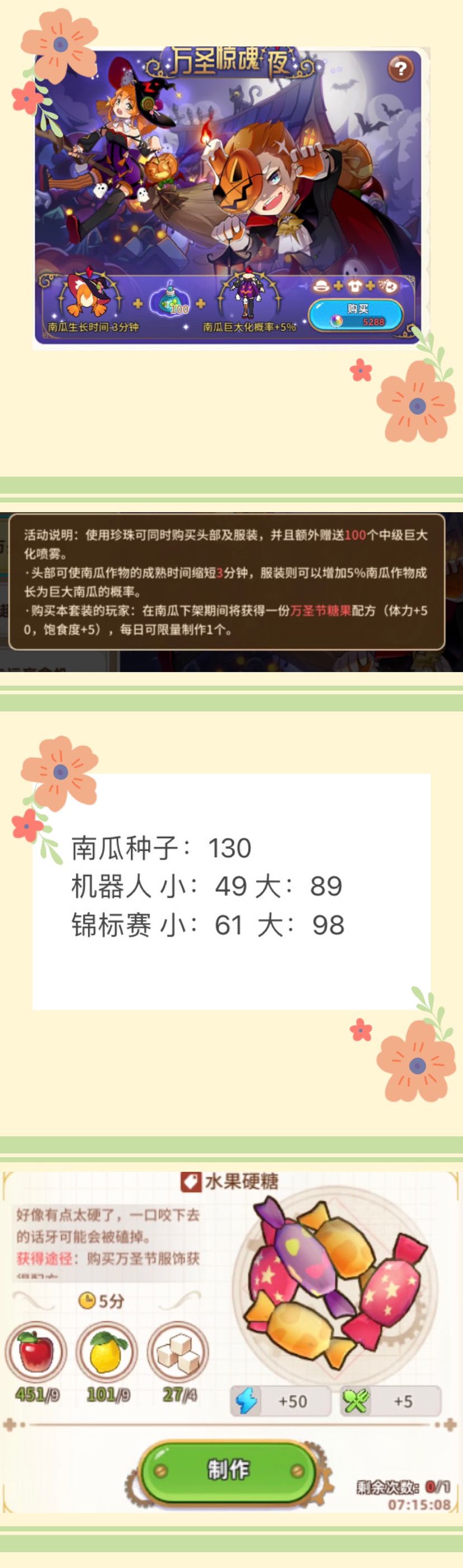 减3分钟(原6分钟),会员可秒熟,南瓜巨大化概率增加5%,另增加50体配方一份(赠送喷雾100)