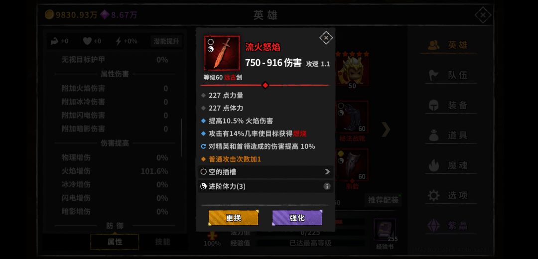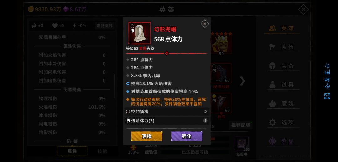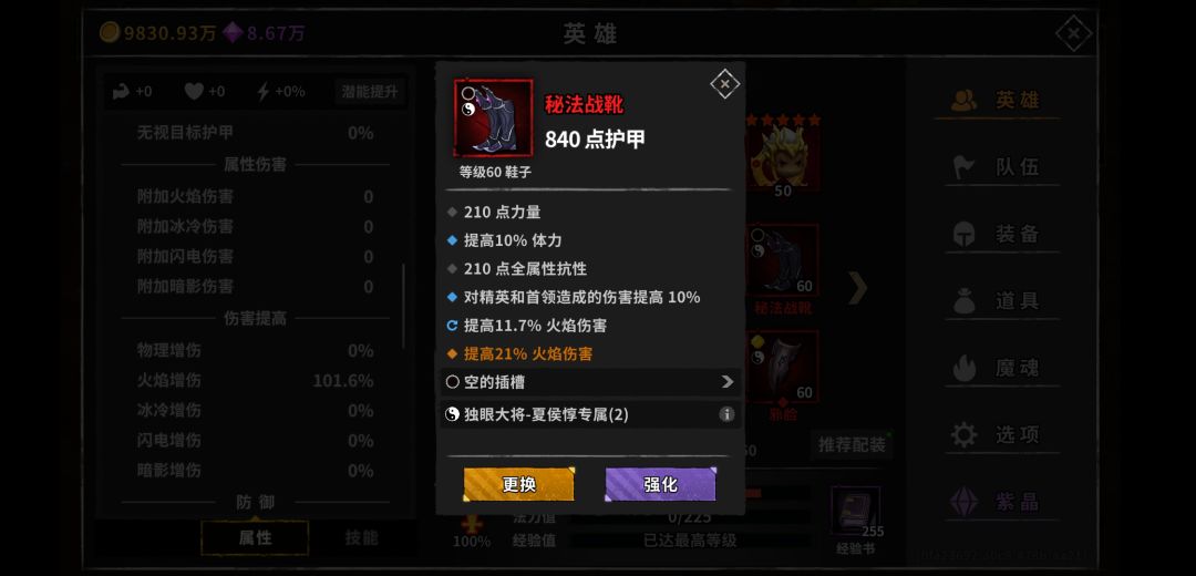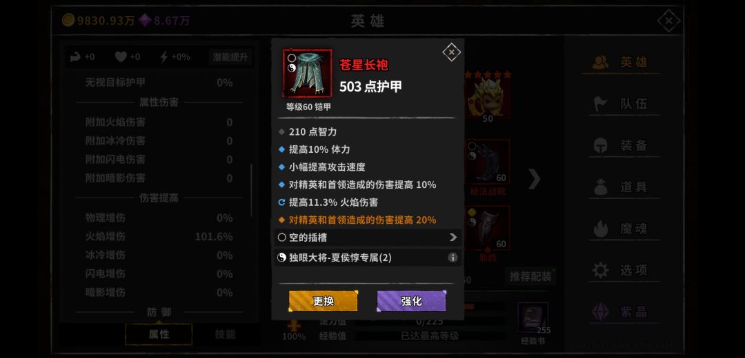 看完基础面板我们再说说增伤,我们都知道,火夏侯的增伤来自于火伤,精英伤,和护盾越高,造成的伤害越高,而夏侯护盾附加的伤害不能暴击,所以不吃暴击爆伤,我们在装备选择上只需要考虑,体力,精英,火伤。
