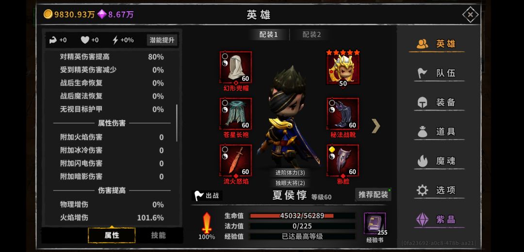 如图,夏侯精英伤80,火伤101,56000的血,这张图带的魔魂
