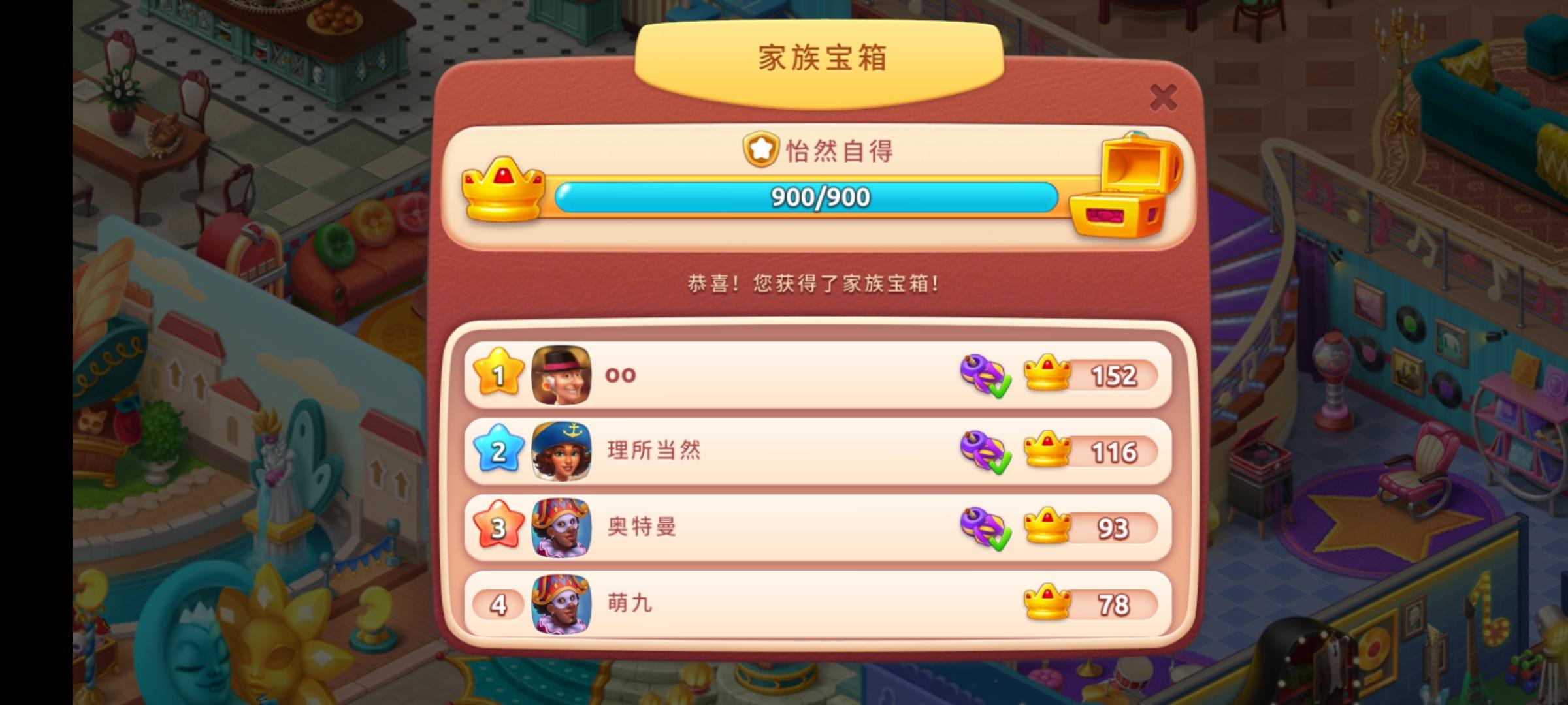 这两天我光顾着忙活花园了,把家园给忽视了,今天刚进家园发现家族宝箱打开了,哈哈在强而有力的家族里真好!不打关直接能得家族宝箱的奖励,我真的很爱我们家族的小伙伴们!有你们真好。