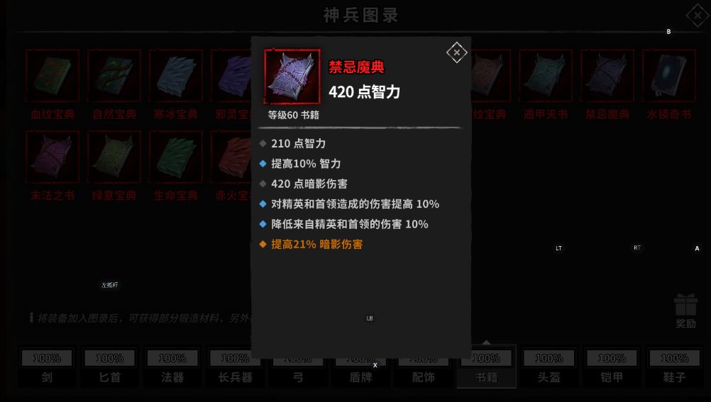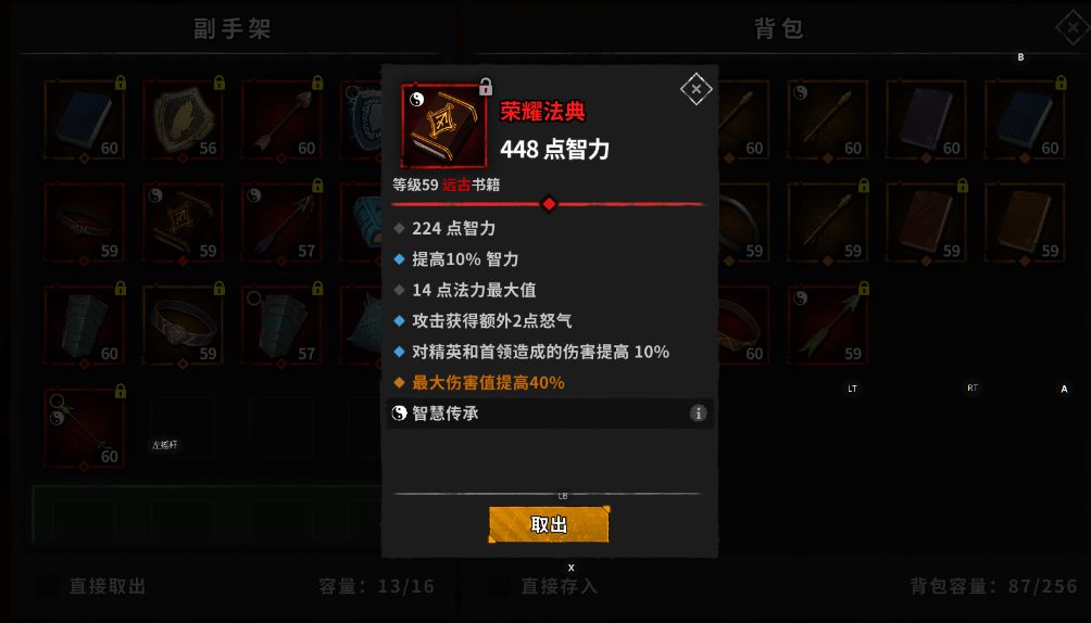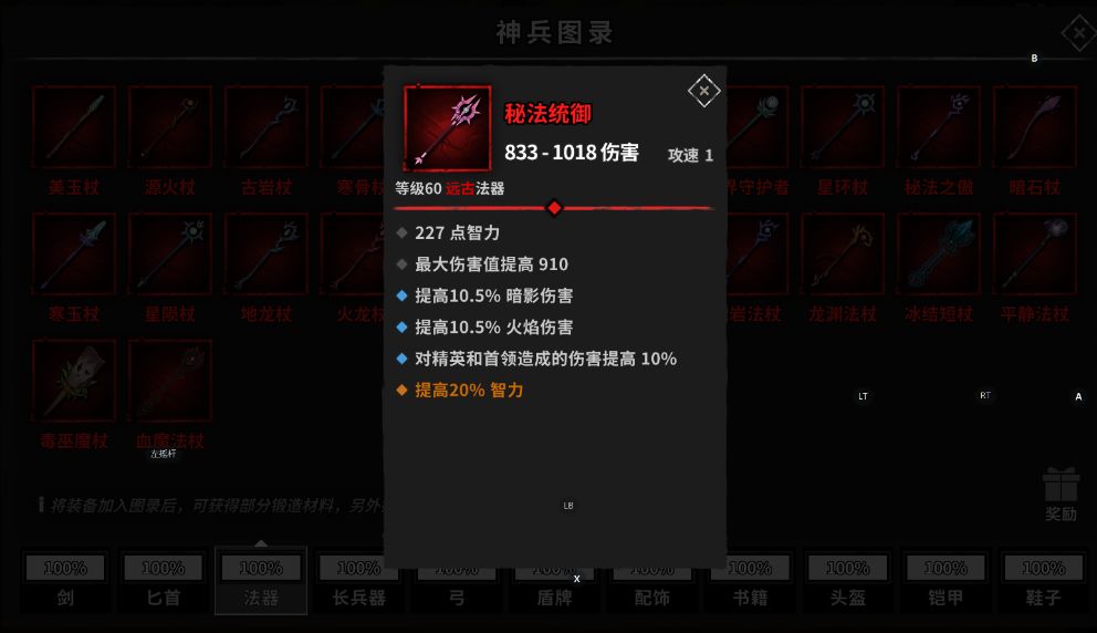 武器大词条我们选择如果暴击,加500暴击伤害的词条,副手大词条我们选择每有一条异常状态,加深7%伤害,因为我们在回蓝的魂上已经打了全体燃烧和全体弱疗,加上甄姬套装的魅惑效果,伤害很高。